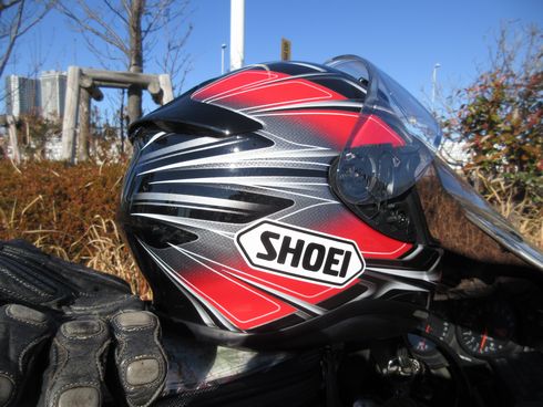 ヘルメットは、SHOEIのZ7です。この斜めのデザインが好きで、欲しいなと思い買いに行ったら生産中止でした。ヤフオクで2023年に見つけて購入です。